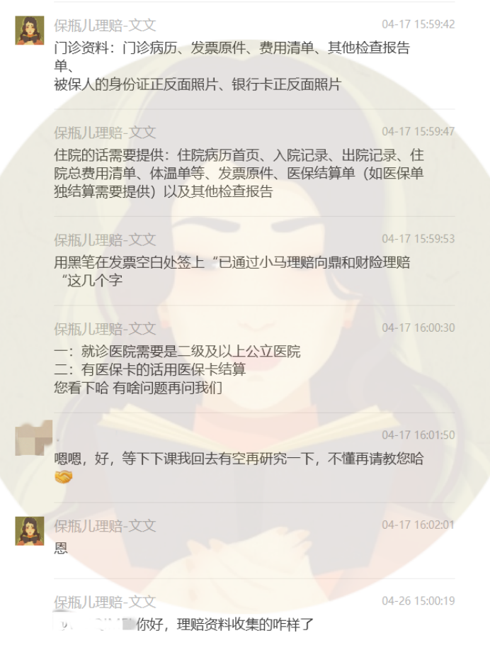 理赔老师赶忙和吴女士确认了理赔关键信息。包括需要哪些理赔材料,是否是公立二级以上医院,是否用医保卡结算等。