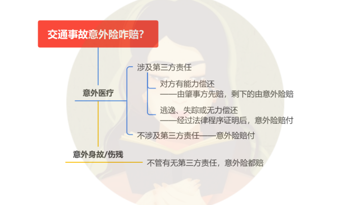 第一种,第三方责任,肇事方愿意赔,余下的由意外险再赔。
